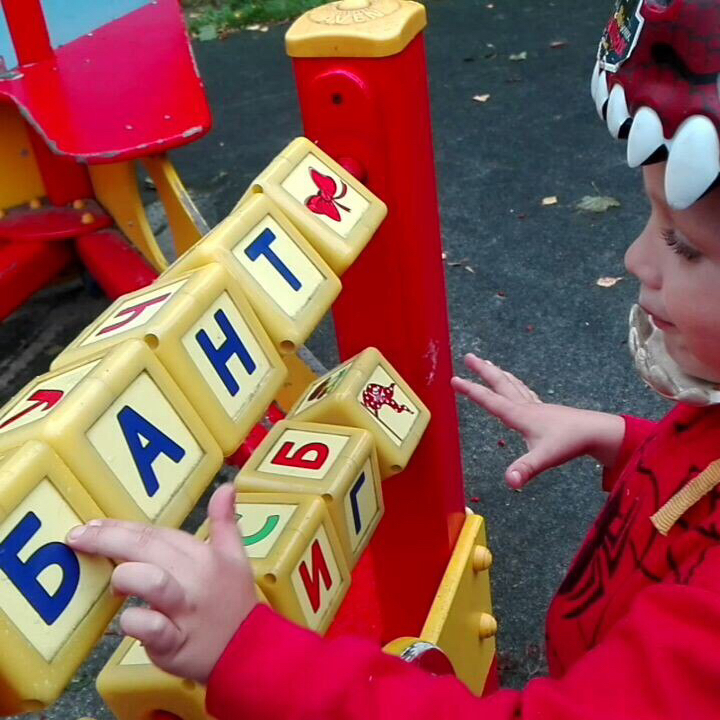 Как итог, Никита читает слова из нескольких слогов, выискивает что прочитать, на площадках проявляет интерес к вот таким кубикам. Доволен собой, а я довольна ребёнком)))