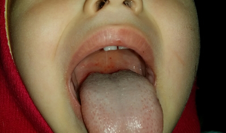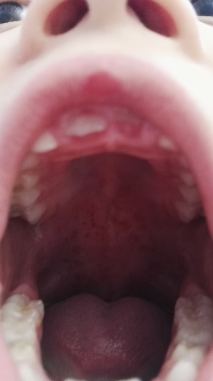Здоровье.Сегодня у ребенка поднялась температура, посмотрела горло ,а там какие то пятна красные идут от горла. Первый раз вижу, что это? Фото под катом