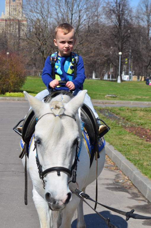 Перед и после спектакля перед входами на сцены гуляют лошадки, готовые покатать всех желающих. Дима обожает такие неожиданные сюрпризы - и в театр сходили, и на лошадке покатались!