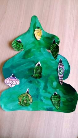 Был лист с новогодними игрушками, Глеб раскрасил и вырезал их, вместе мы сделали из ватмана елочку и украсили ее этими игрушками. Вот такая красота получилась.