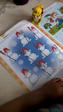 А еще выполняли похожее задание в пособии от Школы Семи Гномов, необходимо было найти 2 одинаковых снеговиков, а также посчитать их всех, найти тех, кто говорит вправо, а кто влево.