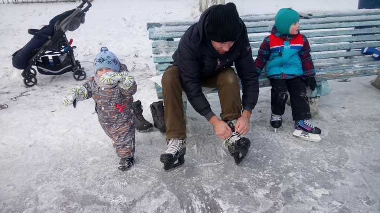 Мы не поверили ушам!)) быстренько собрались и побежали, пока не передумал)) да с утра и вечером. Причем папа наш прихватил свои коньки и клюшку🏒.