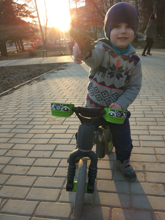 Развлечения.Помнится мне мои тщетные попытки в семь лет оседлать железного коня, особенно хорошо помню сбитые колени и конечности синего цвета. А тут сел и поехал. Что-то я такая влюбленная в своего ребенка. Конечно огромная заслуга во всех велоуспехах у нашего беговела. Расцелую ручки тому, кто придумал такую штуку!Мой пост о беговеле тут. Так вот, все те, кто еще думает о том, стоит ли покупать беговел, однозначно рекомендую к покупке. Хотя для начала можно взять напрокат и попробовать, т.к. есть вариант, что ребенку просто не придется по душе данный агрегат. Но уж если выстрелило, то все! Это спасение от медленнопередвигающихся детей. С ним хоть в поликлинику, хоть в магазин или в садик. Да и вот какие результаты дает катание на беговеле. Егор откатался один сезон, в этом году конь наш ретивый стал маловат наезднику. Встал вопрос о приобретении нового транспорта.Решила я испробовать наследственный велосипед, который с приставными колесиками. Только колеса сразу убрала, они только мешают. И Кот мой как сел, как поехал с воплями "Маааамааа, я боюсь!", как упал! В общем, падение было всего одно, а далее уверенная езда. Велосипед обещала проапгрейдить звоночком. Велосипедных фото еще нет, так что ставлю беговельную.