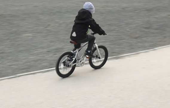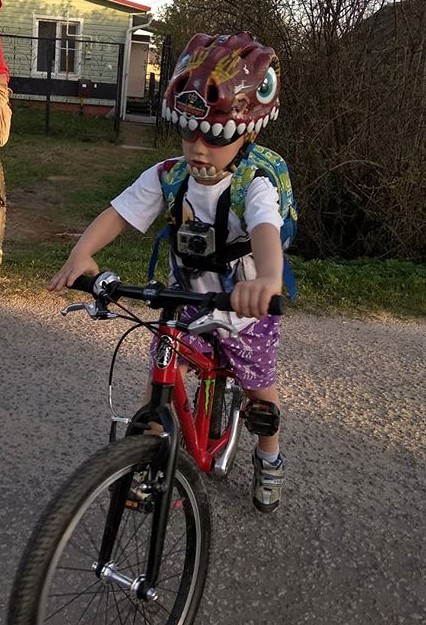На тренировках занимается на прокатном Лисапеде 16" (самое то по размеру)