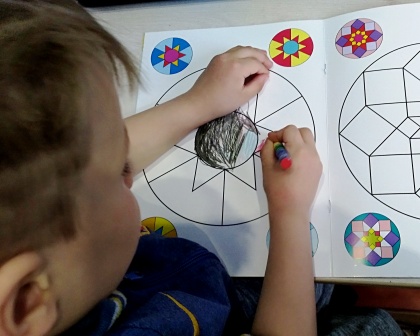 Далее я предложила сделать свой цирк, Глеб конечно с радостью согласился. Но какой цирк без красивых кулис и красочного представления. Поэтому мы раскрасили красочные орнаменты из кратной вкладки с пособия ШКОЛЫ СЕМИ ШКОЛЫ , Сразу я рассказала о теплых и холодных цветах.