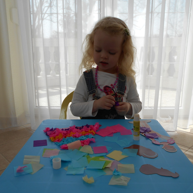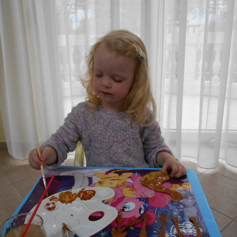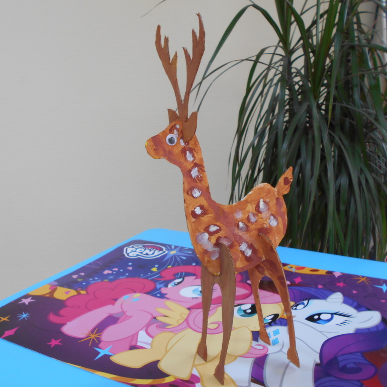 А это процесс создания маленького олененка. Вырезанная из картона фигурка животного у нас появилась еще в новогодние праздники, но как-то не очень заинтересовала. А вот после посещения Медвежьей фермы (Medveotthon, Veresegyház), где видели живого олененка, идея раскрасить бумажного очень понравилась.