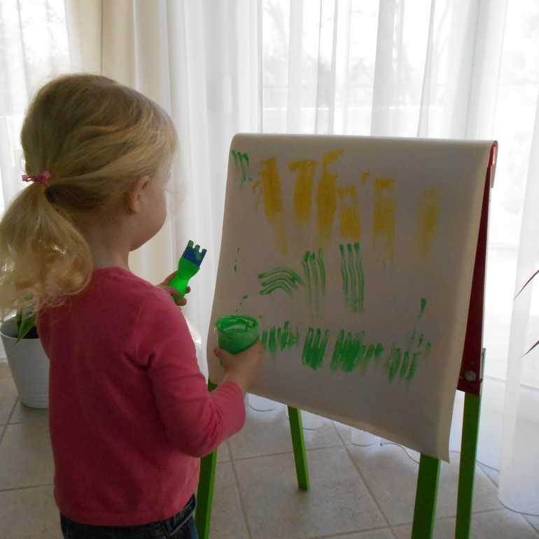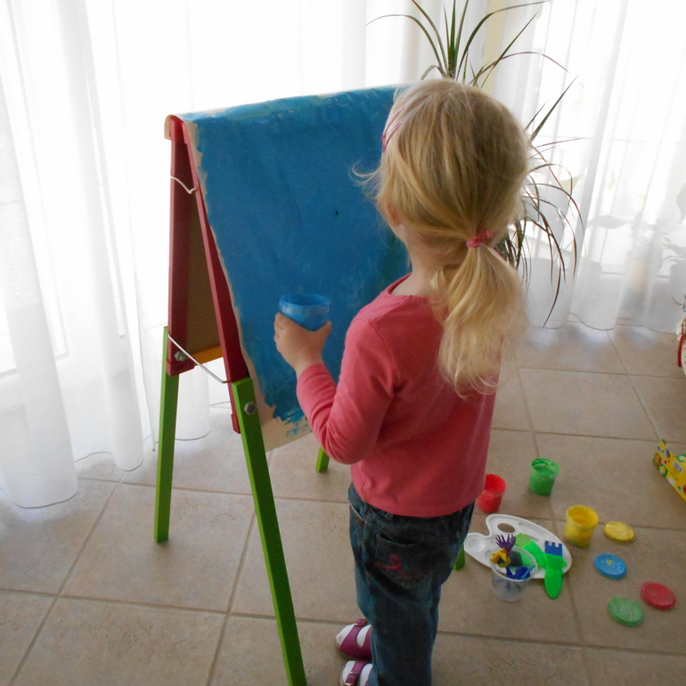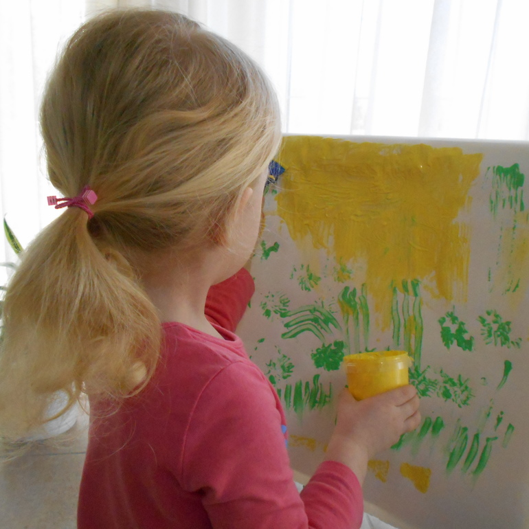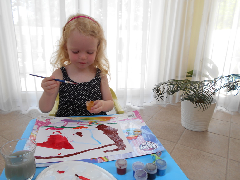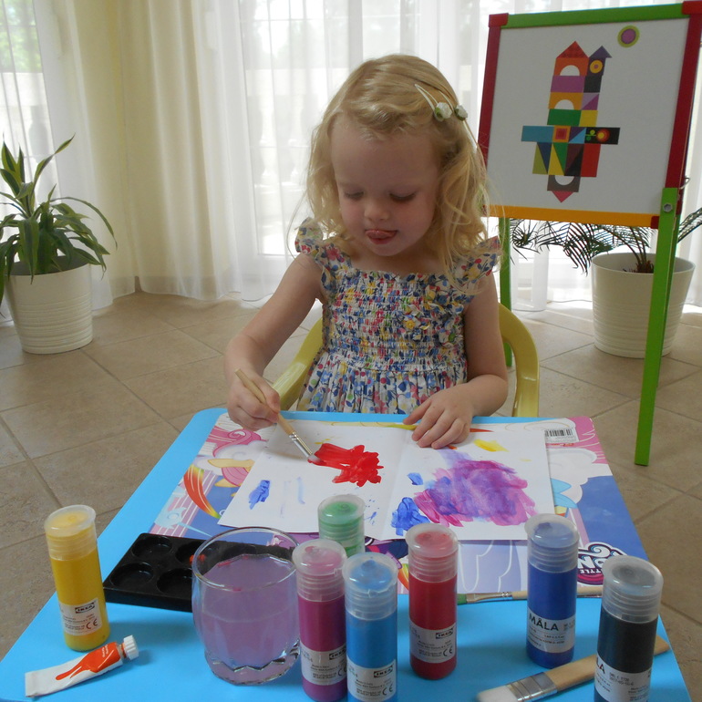Грета очень увлечена процессом нанесения краски на бумагу