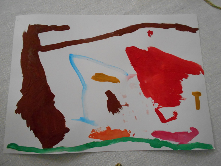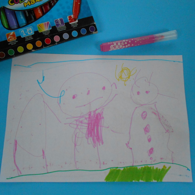 А эта работа называется "Наша семья - папа, мама, Грета". Видим голубую горизонтальную линию неба, желтый круг солнца, зеленую горизонтальную полоску травы и три фигуры. Папа - в центре рисунка, мама справа, Грета слева. Себя Грета изобразила типичным для ее возраста головоногом с глазами в виде точек и носом. Рот отсутствует и рук пока тоже не наблюдаем, без волос. А вот у папы рот есть, и руки, но нет волос. У мамы длинное платье с пуговицами и ног не видно, но есть волосы на голове. Очень подробно об изображении человека в детских рисунках и о примерной периодизации изменений можно почитать в книге Марины Озеровой: О детском рисовании. Конечно, это не первая попытка Греты нарисовать человека и наблюдается явный прогресс в детализации изображения. Работа ценна для меня тем, что дочка сама выбрала тему рисунка и композицию