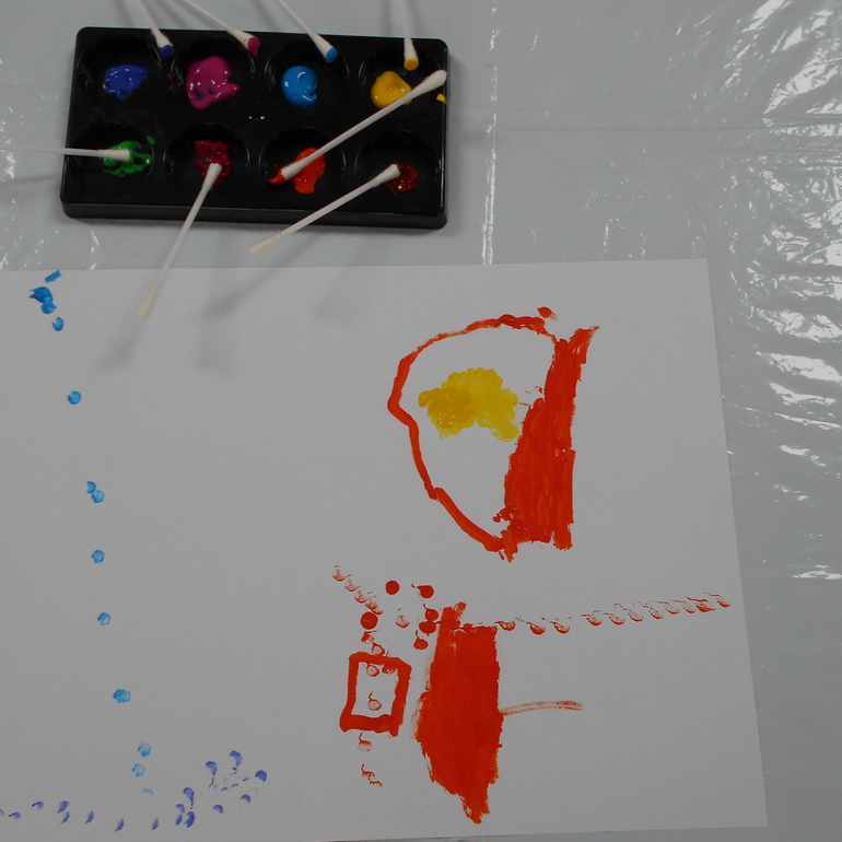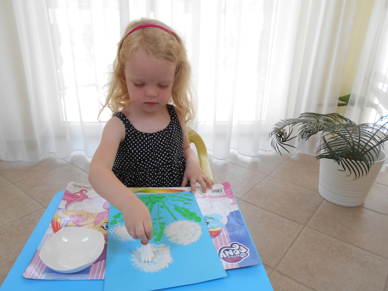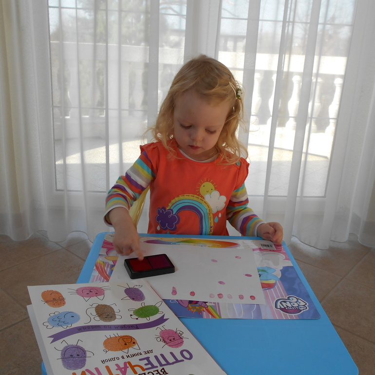Это далеко не первый эксперимент такого рода. Грета уже испытала палочки в альбомах для малышей из серии "Рисуем пальчиками". Только красить пальчиками категорически отказывалась, пришлось предложить другой инструмент.
