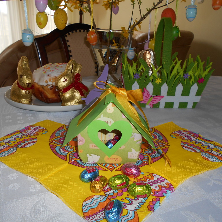 На просторах Интернета можно найти много шаблонов. Меня вдохновила вот такая идея. Я выбрала декоративный картон с пасхальными зайчиками. Крышу домика и отделку сделала салатового цвета, ленточку взяла ярко-желтую. В качестве декора добавила еще бумажную бабочку. Получилось, на мой взгляд, очень миленько.