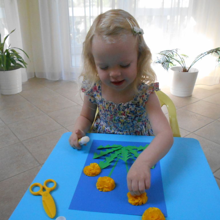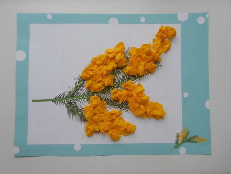 Была у нас и типично весенняя работа. Клеили вот такую веточку мимозы из гофробумаги