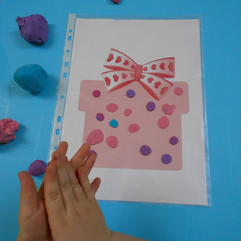 Не могу сказать, что сейчас пластилин или цветное тесто у нас в фаворитах. Раньше как-то было больше энтузиазма. Сейчас приходится придумывать, как привлечь внимание. Иногда Грета любит просто скатать колбаску и резать ее на мелкие кусочки (еда для животных), в другой раз с удовольствием катает шарики и что-то украшает, например вот такую коробку с подарком.