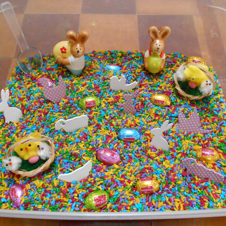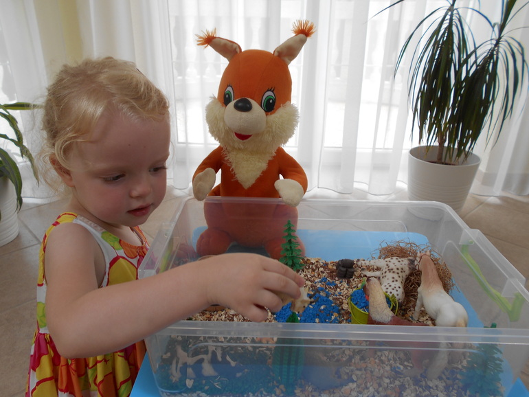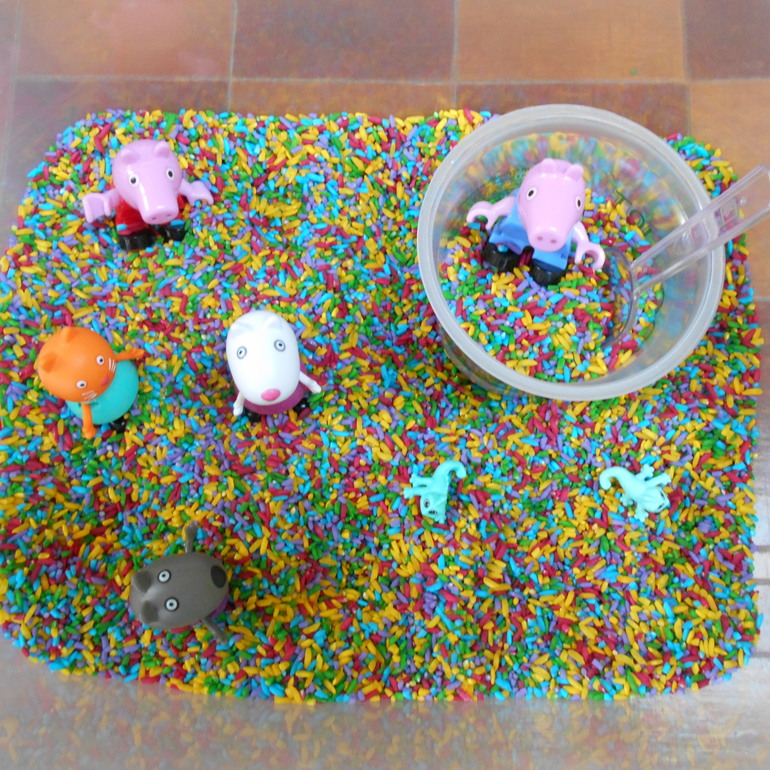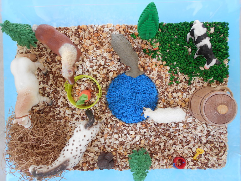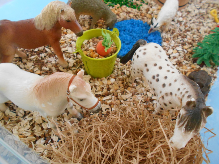 Рассыпанный по всему дому цветной рис во внимание не принимаем, молча включаем пылесос. Естественно, это не первая сенсорная коробка. Были у нас и с разноцветной фасолью разных сортов, и с манкой вперемешку с рисом (учились работать с ситечком), и с разными макаронами (учились сортировать) и вот такая ферма с разными крупами (гречка, колотый горох, овсяные хлопья, перловая крупа). Вода - окрашенная крупная соль, сеном стал наполнитель из подарочной коробки.