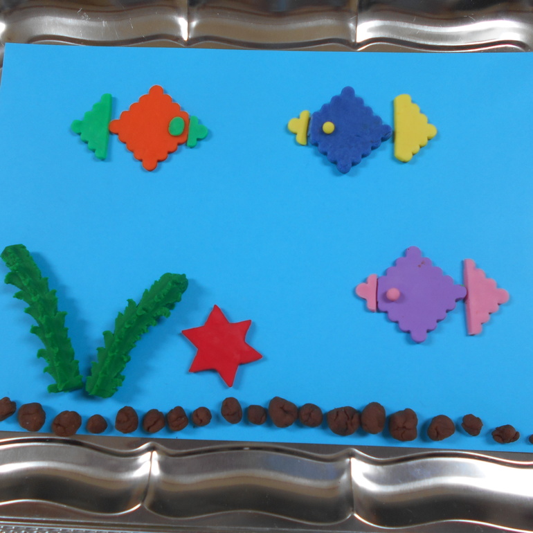 Делали мы и такой пластилиновый аквариум. Использовали пластилин и цветное тесто Play Dough. Водоросли сделали из теста с помощью пресса. Камешки-шарики Грета сделала из коричневого пластилина, рыбок и морскую звезду - из теста и пластилина с помощью формочек для печенья