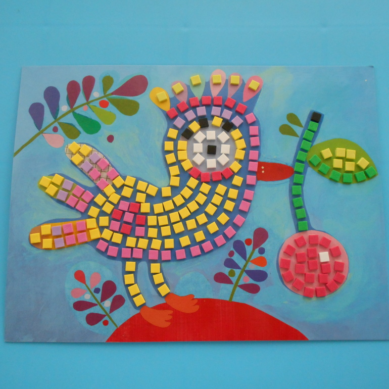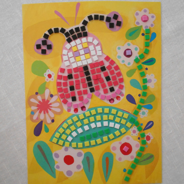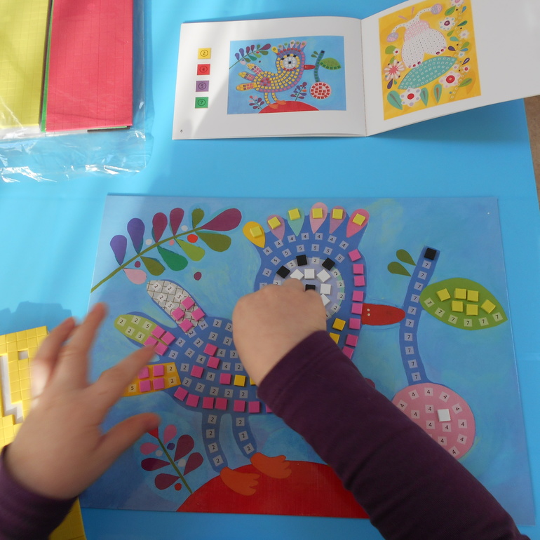 Кроме рисования Грета с удовольствием "творит" картинки из мозаики. У нас был вот такой набор для творчества от Djeco Мозаика с наклейками по номерам "Птица и божья коровка". Несмотря на заявленный производителем возраст от 4-х лет, Грета в свои 3 с небольшим прекрасно справилась с мозаикой, заодно и некоторые цифры повторили