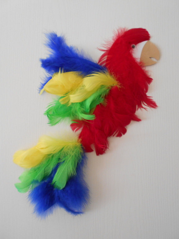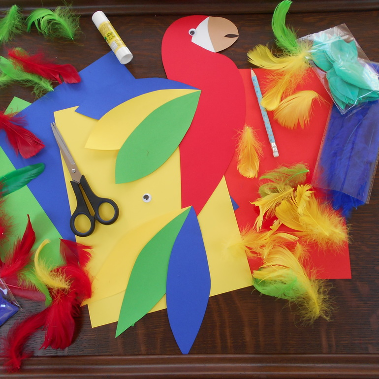 Идея показать дочке, что и как можно сделать с цветными перьями давно не давала мне покоя, но я все никак не могла придумать, как ее реализовать. И в очередной раз убедилась, что все необычное рядом, просто, нужно уметь его замечать. Иногда мы с дочкой заходим в зоомагазин, где хозяин разрешает покормить кроликов и морских свинок, можно посмотреть птиц и послушать их пение, понаблюдать за рыбками. Так вот, в этом магазине живет большой крикливый попугай ара. Одним словом, это он натолкнул меня на эту красочную идею чуда в перьях. Все, что нам понадобилось - это цветная бумага и перья.