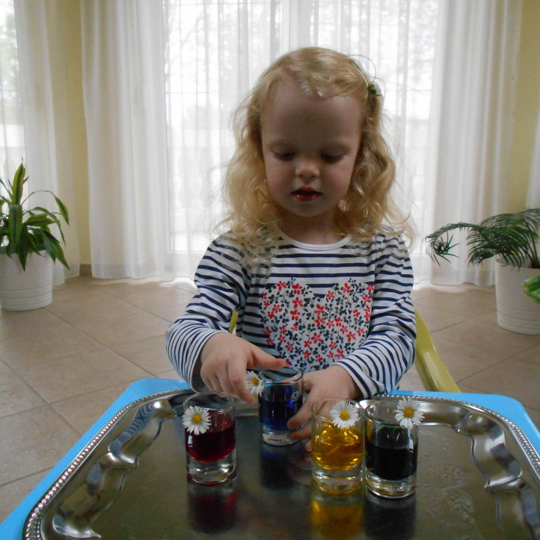 Не обошлось у нас и без "научных" экспериментов. Когда читали Бьянка Минте-Кениг: Весна. Находилки - развивалки. ФГОС, вдохновились идеей "голубой тюльпан". Правда, мы взяли не белый тюльпан, а белые маргаритки и сразу четыре краски разного цвета