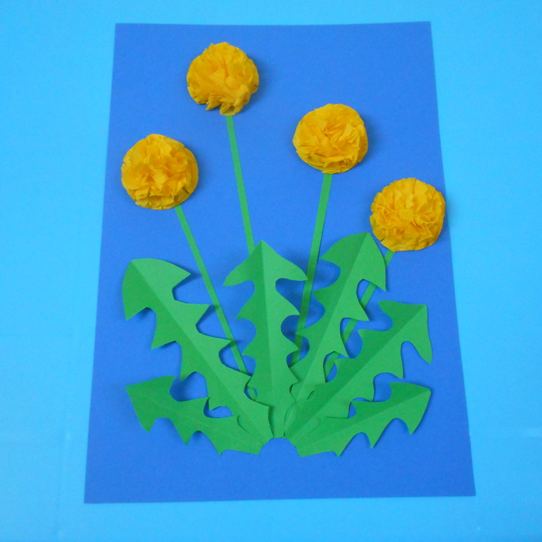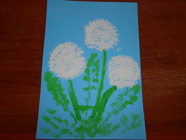 А это наша совместная работа. В процессе создания одуванчиков мы использовали сразу несколько техник (отпечатки листьев одуванчика, белый шар одуванчика рисовали ватными палочками, стебли - кисточкой)