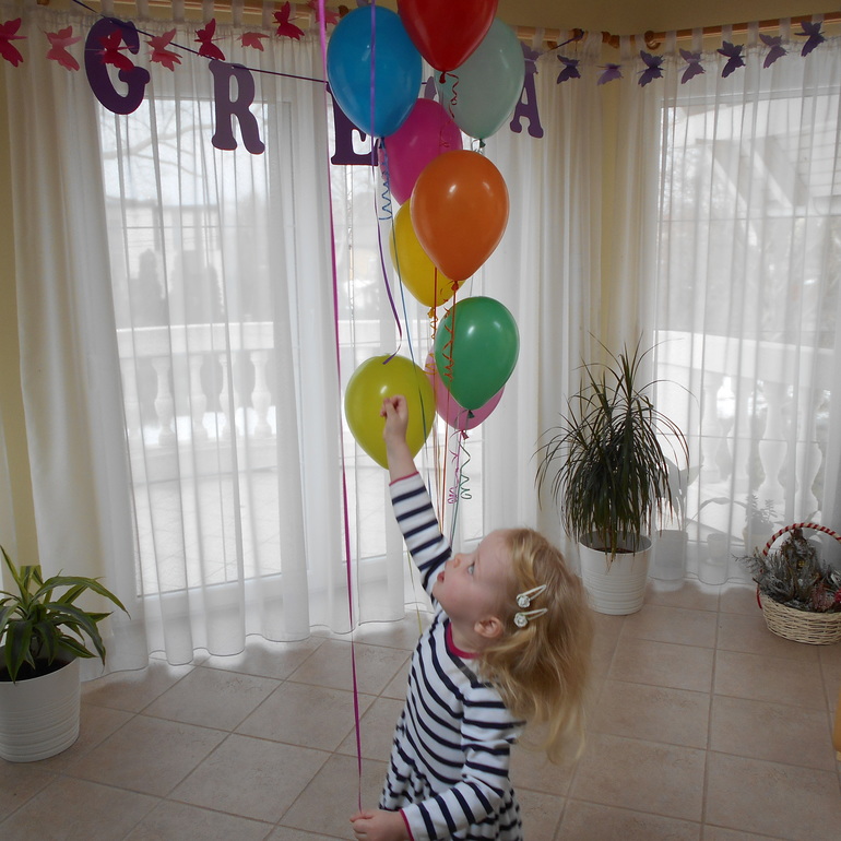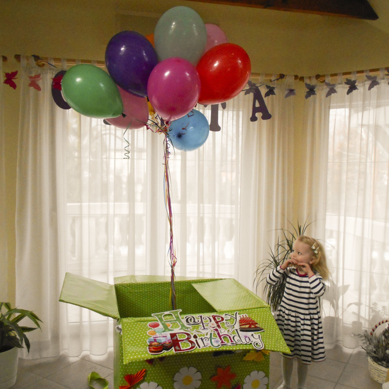 Какой же детский праздник без разноцветных воздушных шаров? Мы точно знали, что Грета оценит этот сюрприз. Решили, что спрячем их в большой коробке.