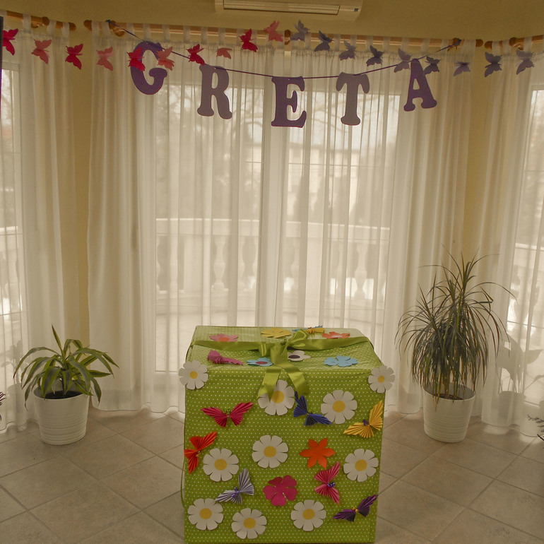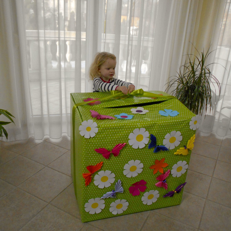 Спрятать в доме такую большую коробку и незаметно ее украсить было просто нереально. Дочка видела, что мама с пакой что-то там "колдуют" над огромной коробкой, обклеивая ее бумагой и украшая цветами и бабочками, но что именно там будет она вряд ли догадывалась. Сюрприз действительно удался!