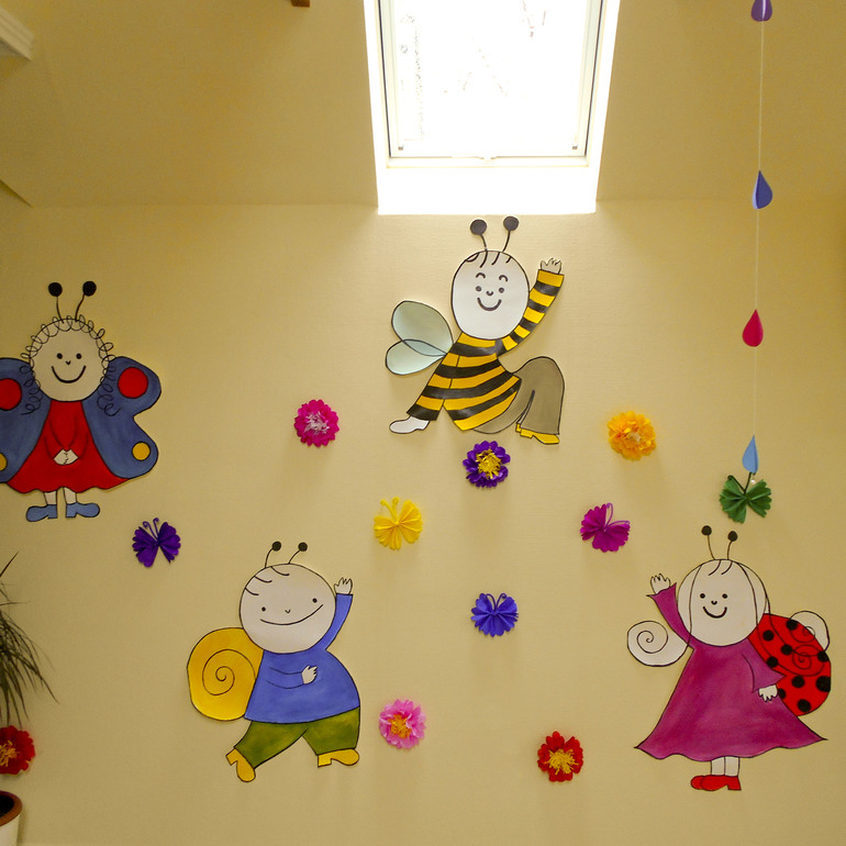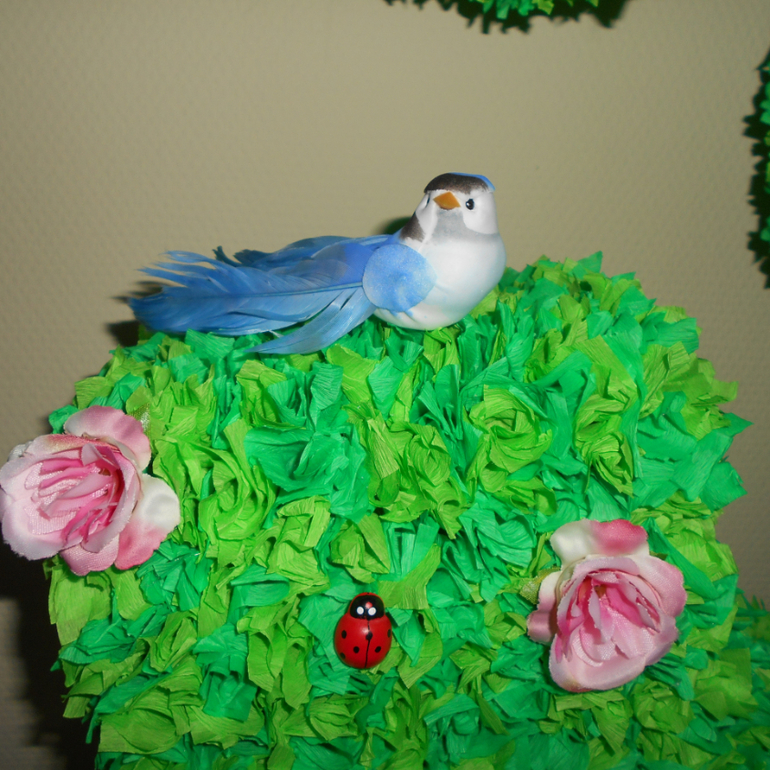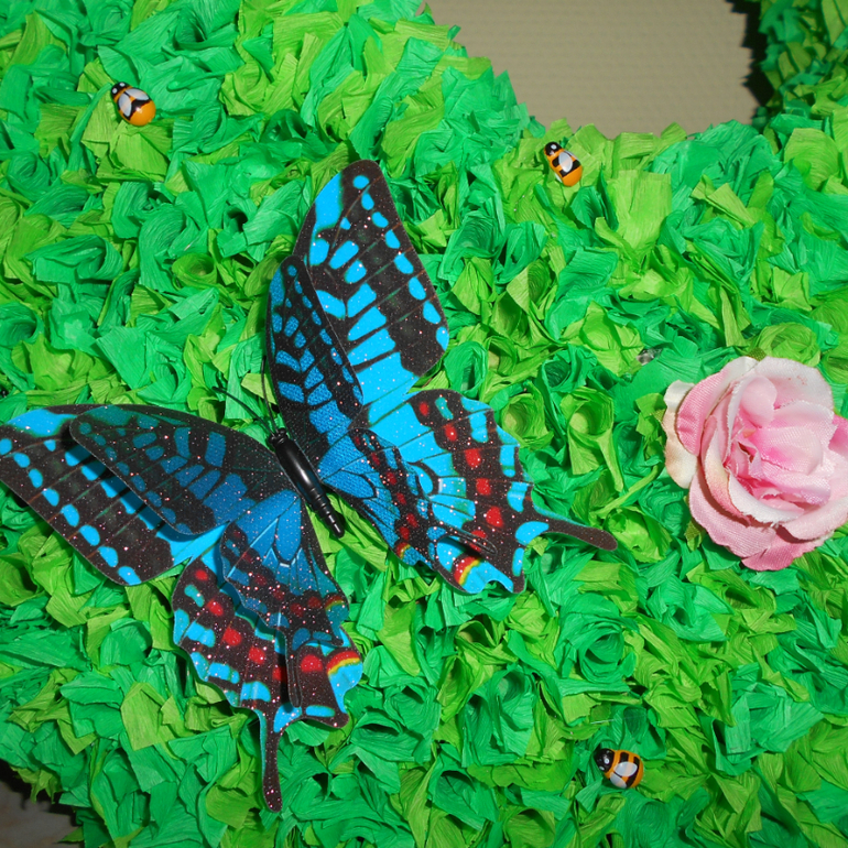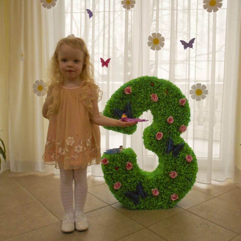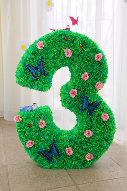 Подобрала вариант оформления и взялась за работу. Это, пожалуй, был один из самых трудоемких этапов подготовки. Здорово помог папа, когда склеил основу цифры из картона. Для оформления выбрала гофрированную бумагу двух оттенков зеленого. За окном зима, а у нас зеленый луг, бабочки, птички, цветочки, стрекозы, пчелки, божьи коровки