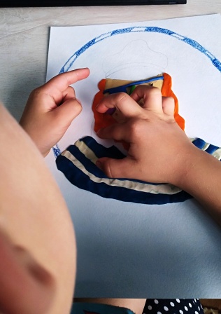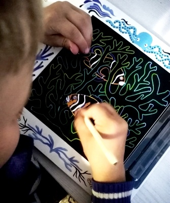 Глеб так заинтересовался темой море и подводного мира, что мы продолжали между уроками изучать обитателей подводного мира. Например, рисовал в Арт граттаж «Тайны океана»