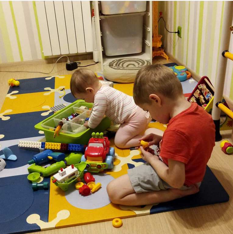 Сейчас пока играют вместе какое-то время (3,5 и 9 месяцев). Старший наблюдает за младшим, даёт ему игрушки. Смеются вместе, бесятся. Старшему интересно с мелким. И ещё он следит, чтобы младший не тянул в рот игрушки с мелкими деталями, не лез к проводам и т. д. Младший тоже любит компанию брата, если хнычет от скуки, то хватает брата, мне даже не надо подходить)