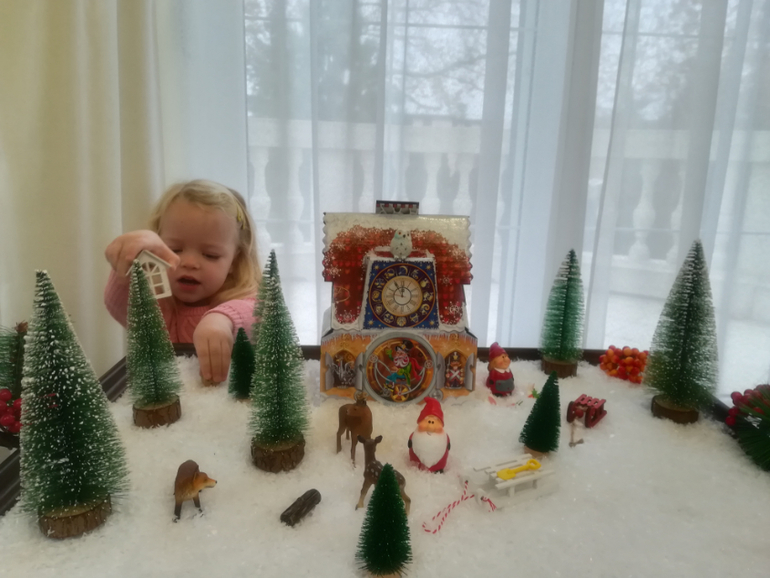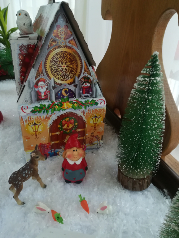 Фигурка белобородого сказочного добряка Санты виднеется на заднем плане. Будто он есть и одновременно его нет. А вот сказочная деревенька, в которой теперь живут его верные помощники рождественские гномы, забавная парочка Вилле и Сноуфлейк, животные и птицы, выросла всего за пару часов до пробуждения Греты.