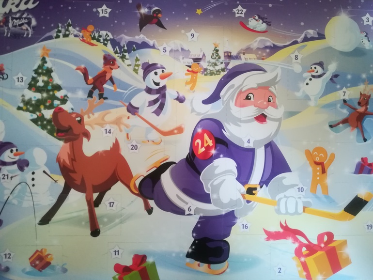 В первый день, впрочем как и в другие дни, задания скорее для развлечения и приятного времяпрепровождения с мамой. Так вот, в первый день Санта попросил Грету придумать имена гномам (так у нас появились Вилле и Сноуфлейк), найти цифру 1 на бороде-календаре и приклеить ватный шарик и послушать для настроения любимую песенку "Jingle Bells". Без шоколадного календаря у нас тоже не обошлось. Но теперь по просьбе Санты только одна сладкая фигурка в день. Интересно, что фигурка под цифрой 1 - коньки. В этом сезоне Грета первый раз в жизни стала на коньки и пока просто рвется на занятия, несмотря на ссадины и синяки.