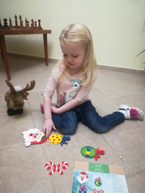 Я всегда по просьбе Греты помогаю ей. Скорее это касается таких заданий, как гирлянда, новогодняя игрушка или наклеивание пайеток, как, например, в этой поделке. Картинка симпатичная, а выполнение сложновато, поскольку пайетки отдельно, а клейкая основа под них отдельно. По качеству это, конечно, не Djeco. Купила для разнообразия на пробу. Я никогда не устраиваю никакие проверки способностей. Для меня важно прежде всего создание праздничной предрождественской атмосферы и хорошего настроения.