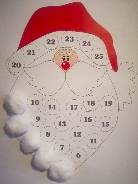 Как и в прошлом году наш адвент-календарь расчитан на 24 дня и закончится в сочельник. Каждый день "распушиваем" бороду Санты ватным шариком.