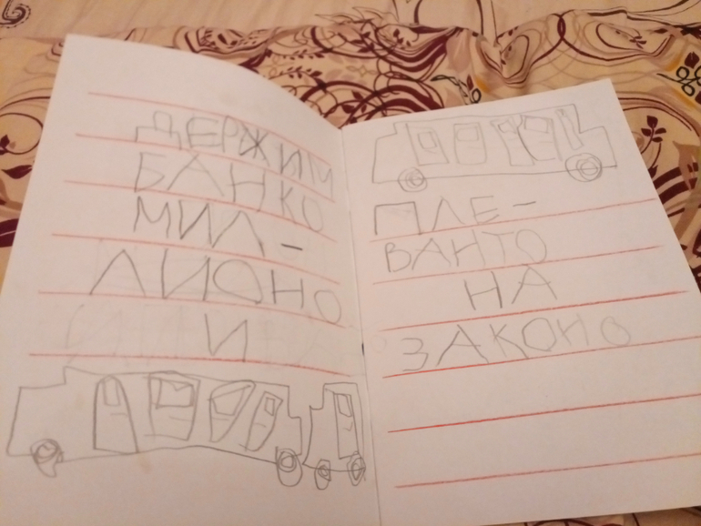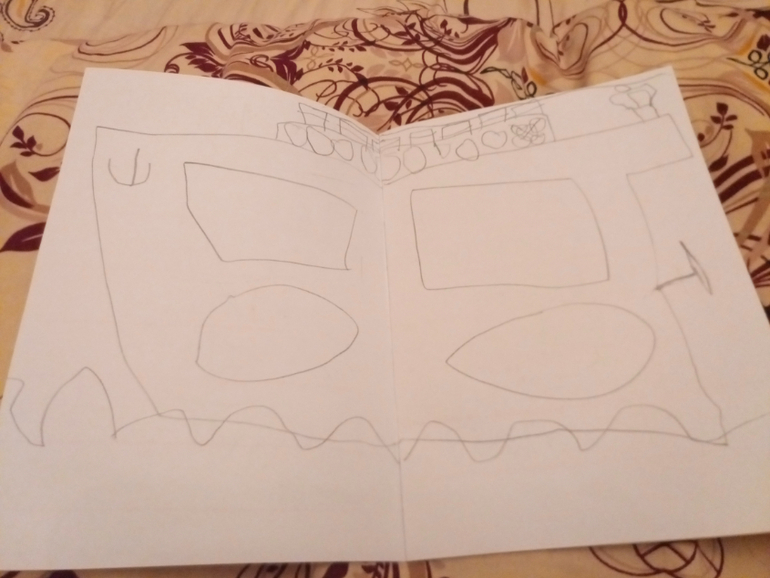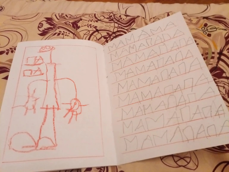 На втором фото - первый разворот. И часть песни бандитов из любимого мультфильма про капитана Врунгеля. Потом "огромный лайнер". Дальше идеи несколько иссякли и идут 3 разворота текста "папа мама". Пробелы пока не сильно уважает. Не осязаемы они))