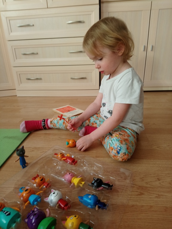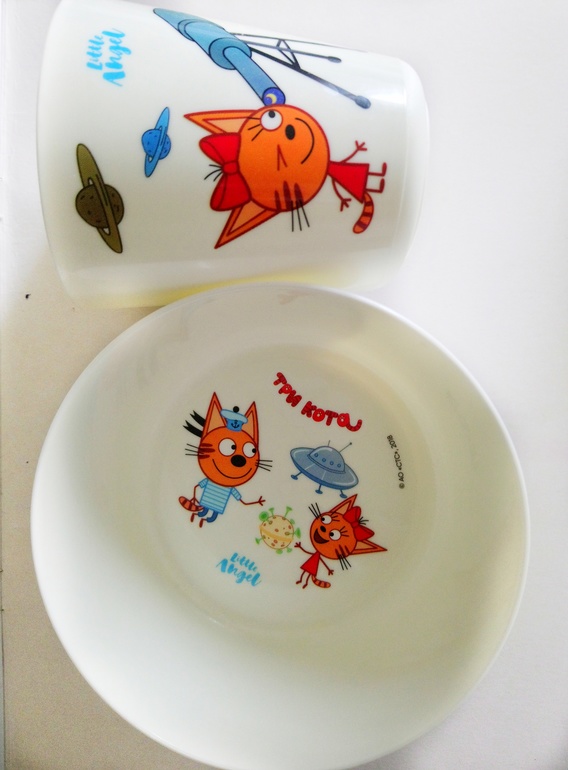 Потом мы с этими котами поехали в деревню к бабушке и дедушке. Там крестная, зная о любви Анютки к ним подарила ей набор посуды с ними