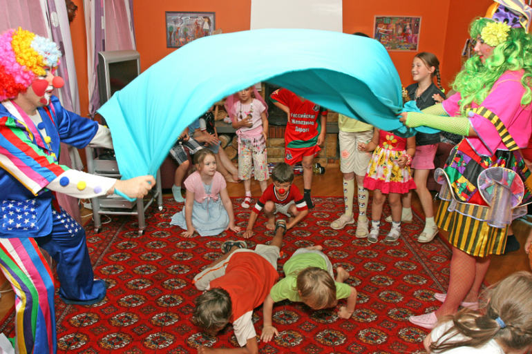 Это не конкурс, игра. Когда аниматоры поднимают ткань, дети должны успеть пробежать, потом ткань опускают и кого-то помедленнее "ловят".