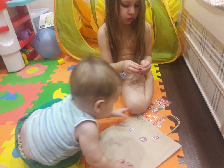 Потом вместе клеили наклейки на пакеты: Аня прикладывала, а мы с Ваней их прижимали. Ваня, конечно, пытался больше их отковырять и в рот засунут, но всё-таки в общем деле поучаствовал: