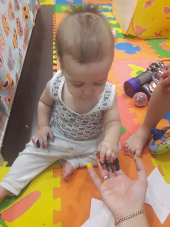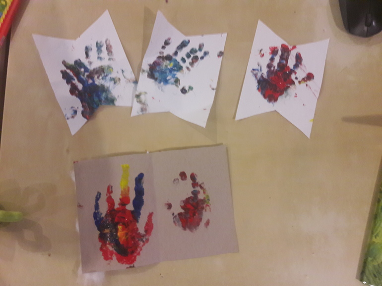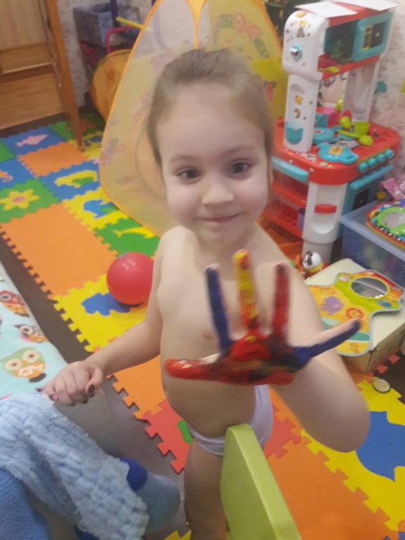 Потом присоединился Ваня. Измазывался в краске он с удовольствием, шлёпал и мял флажки тоже с удовольствием. И в открытее свой след оставил.