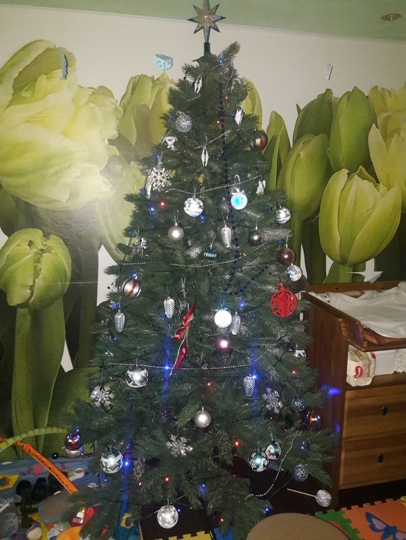 Весь день сегодня ставили ёлку, хотя я больше наблюдала, т.к. заболела и валялась на диване с высокой температурой. Дети счастливы, сын в восторге от елки, ставили её, пока он спал, так он удивился когда её увидел. Вот результат