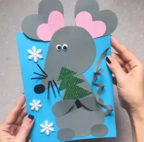 Аппликация "Мышка" в честь животного наступающего года. Поразительна простотой деталей - всего несколько "капелек" и пару сердечек из бумаги.