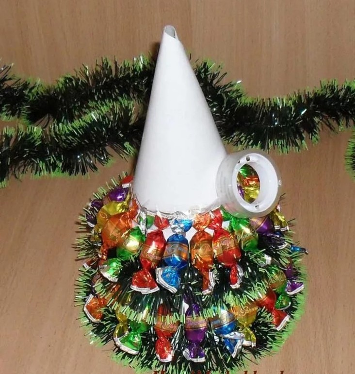 Будем делать большую и достаточно сложную поделку - елку из мишуры и конфет, плюс повесим туда маленькую гирлянду на батарейках. Это будет подарок для дедушки с бабушкой.