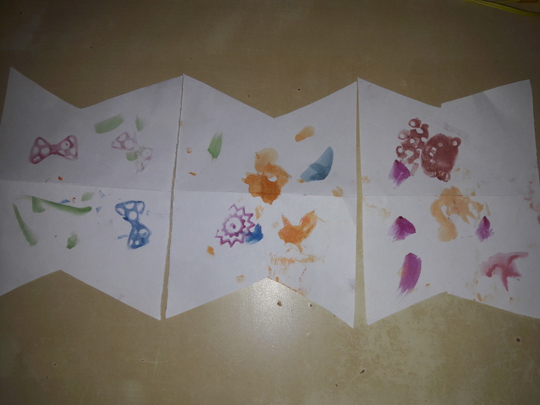 Когда стали делать флажки, Аня попросила ей один оставить, но мы решили вырезать ей отдельно. Ваня сделал свои 3 (Аня разукрашивала штампики).