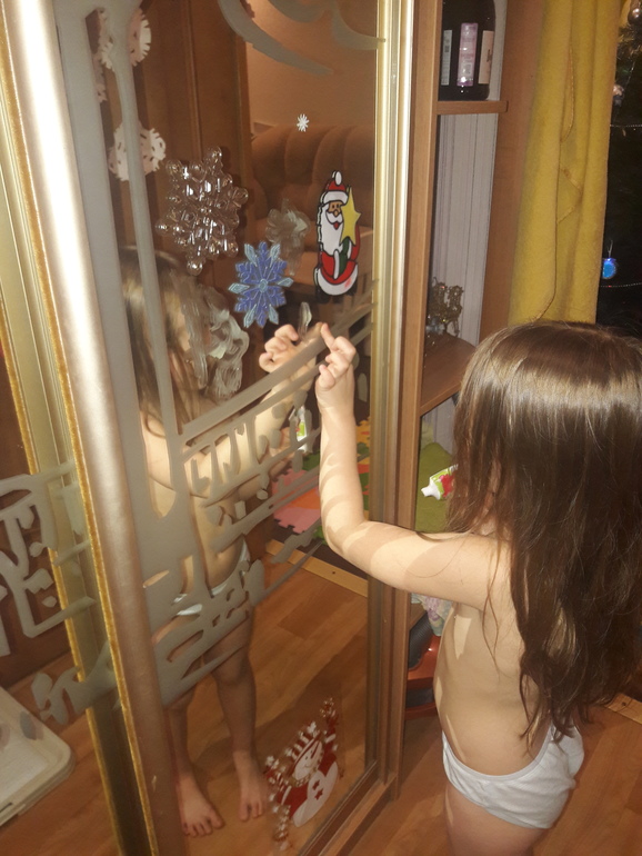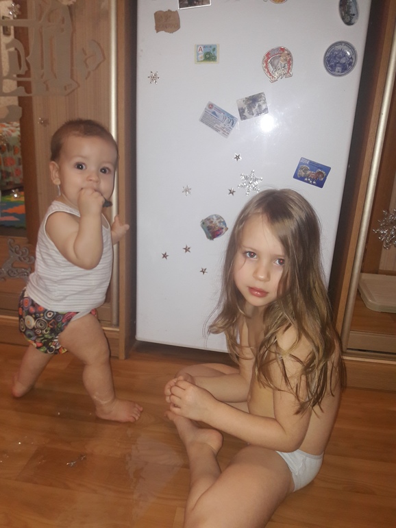 Сначала начали клеить наклейки на зеркала и морозильник. Аня большие, Ваня маленькие (хотя ему быстро надоело и он переключился на магниты)