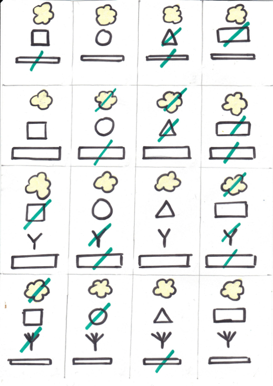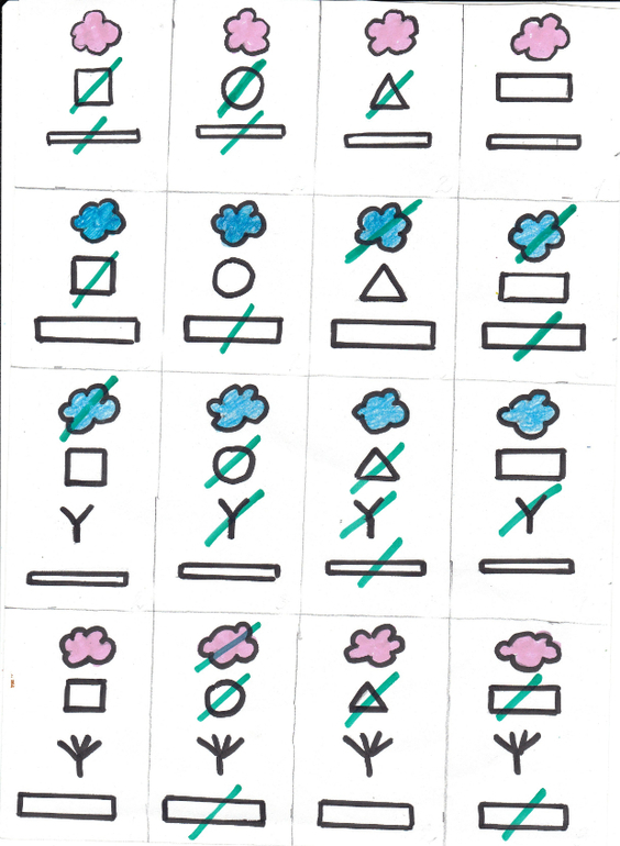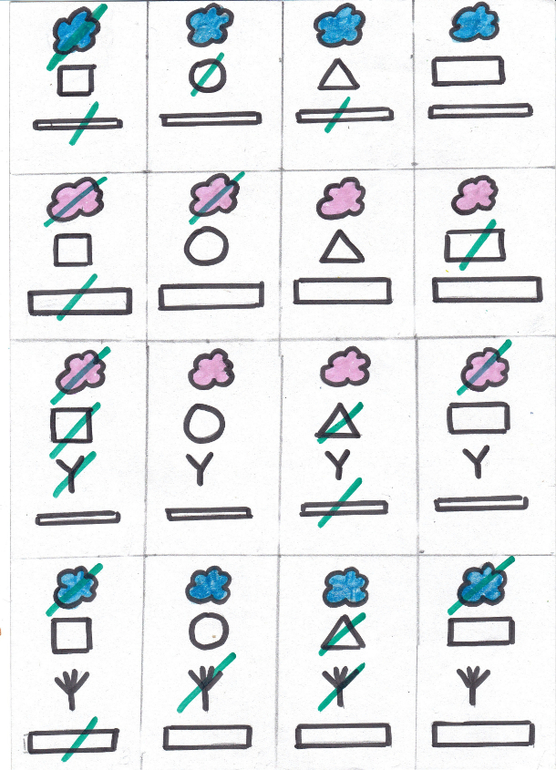 Задание - выбрать фигуры, удовлетворяющие признакам. Верхний символ - цвет. Второй - форма. Последний - толщина. Для карточек с четырьмя признакам - третий признак - размер фигуры (мелнькая, большая), этот символ взят из пособия Петерсон Математическая игралочка.