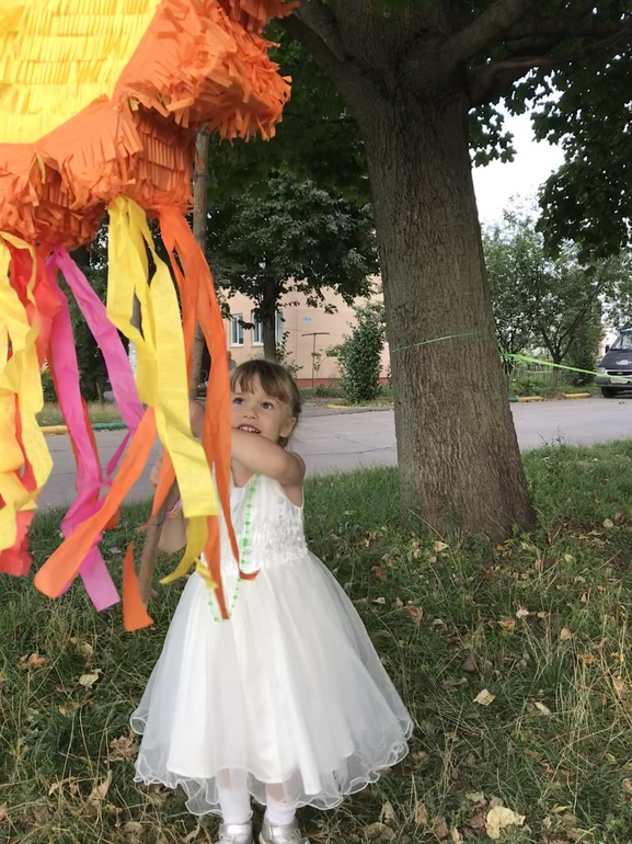 Пиньяту «начинила» свертками с конфетами, чтоб всем по одному свёрточку. И ещё мягкими сердечками, которые потом девочки для себя собрали).