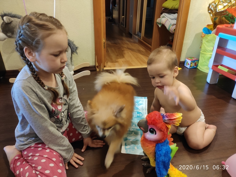 Утро у меня началось рано - в 4:45 проснулся Ваня. Аня встала в 6:30. В зале ее уже ждал подарок - интерактивный попугай Кеша, ну и шарики, конечно.