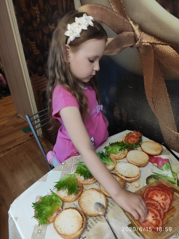 На ужин у нас были бургеры - Аня очень любит их. Помогла мне их приготовить.