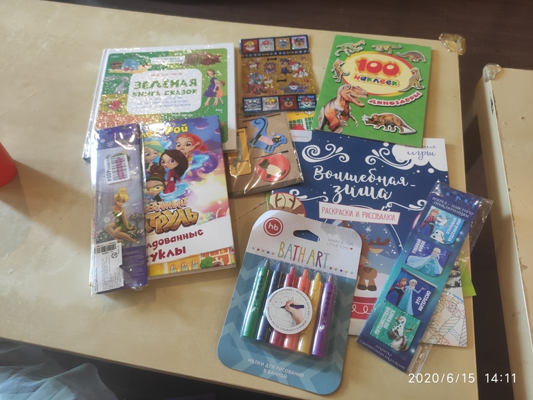 Пообедали, посмотрели мультик. Потом я спрятала много всяких мелких подарочков (наклейки, закладки, раскраски и т.д.) по квартире, загадывала Ане загадки, она разгадывала их и шла искать в это место подарок. Вот такой набор получился.