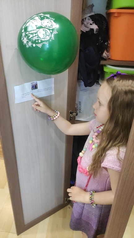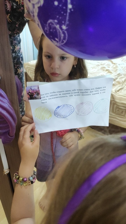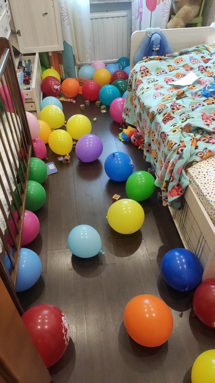 В детской на полу было надуто много шариков, в некоторых из них просто наклейка, а в одном наклейка с запиской, что следующая подсказка на тумбочке.