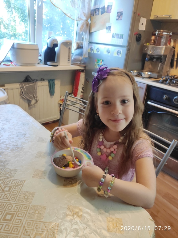 Потом умылись и пошли завтракать. Сегодня у Ани был не обычный завтрак, а ИМЕНИННЫЙ - мороженое. Аня была счастлива.