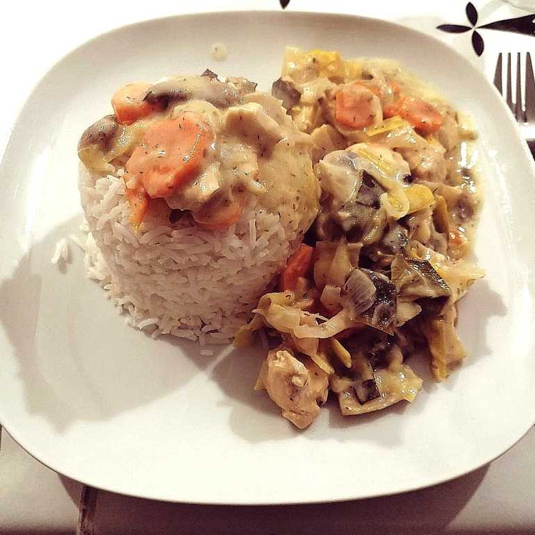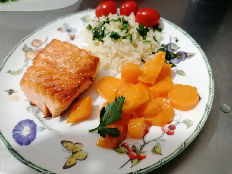 Блюдо должно иметь примерно половину углеводов (допустим, рис и немного тушеных овощей), жиры и белки (есть в рыбе).