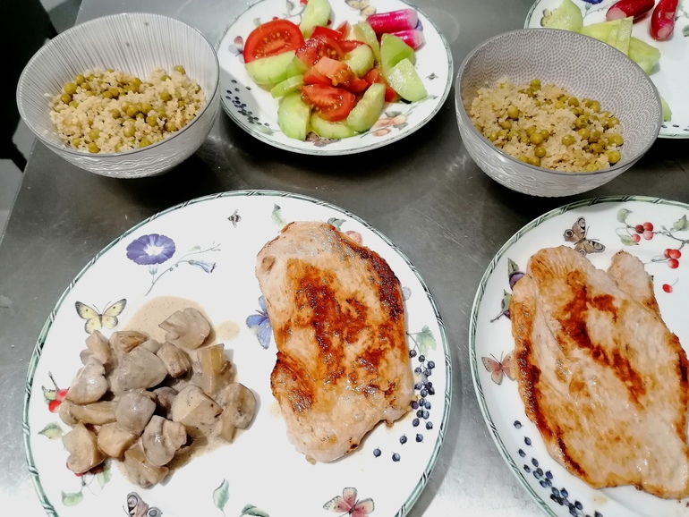 А то, что на фото, это их привычная еда. конечно, и тут бывают споры, допустим, дочка не ест грибы, а сын их просто обожает, готовлю отдельно. Но в целом это все их рацион. Периодически ужины заменяю на кашу или блинчики, сырники... Бывают и макароны, естественно, но к сож, пасту готовлю тоже раздельно, тк дети не любят соусов, которые я люблю, типо карбонары.